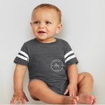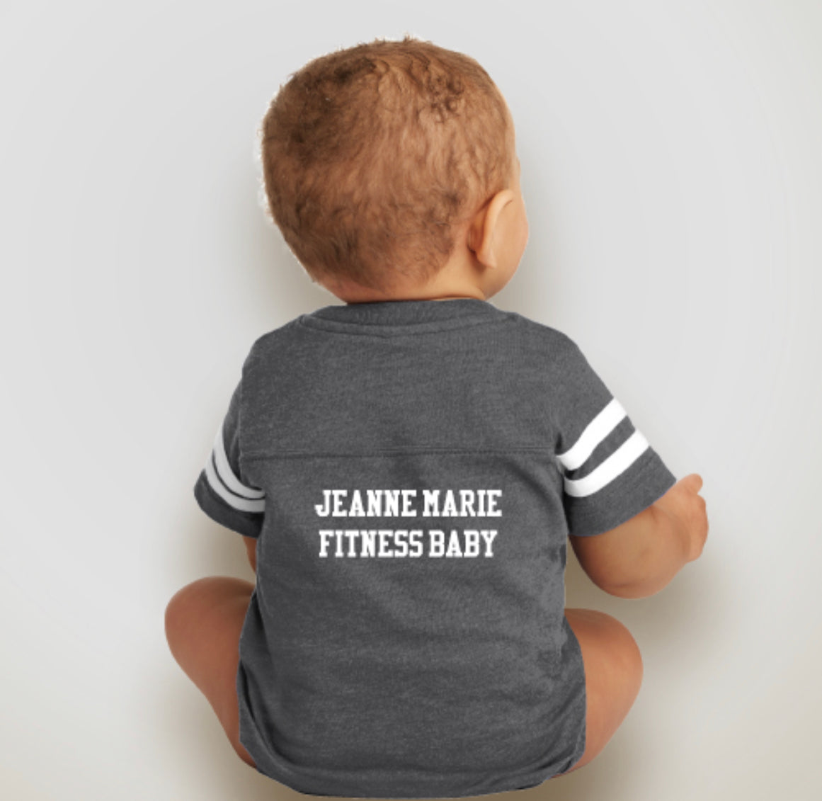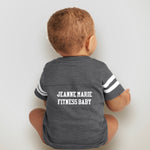 Grey jersey style onesie with white ‘Jeanne Marie Fitness baby’ text.